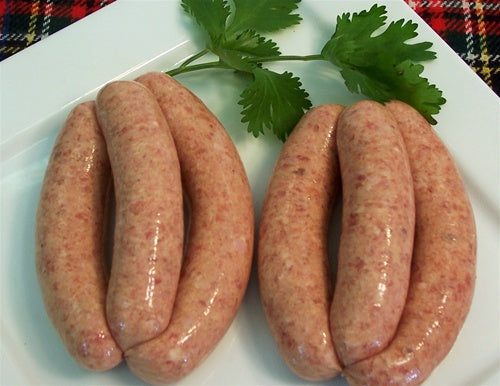 Homemade Scottish style sausage links made with Angus beef and natural spices, sea salt, Gluten free no preservatives.