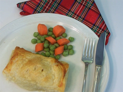 A Bridie is made with Angus beef sausage meat, pork meat with onions and wrapped in a baked puff pastry.